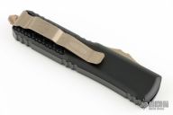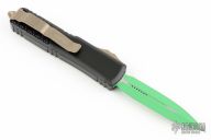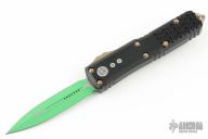 This UTX-85 OTF Automatic from Microtech features a green cerakoted double-edged blade with fuller. The handle has a black aluminum tri grip frame with bronzed steel thumb slide, clip and glass breaker. Dated 06/2022 with a S/N of 5694. Includes original box and papers. Excellent condition.