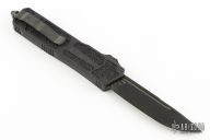 The Microtech Scarab II is a high quality tactical out-the-front knife, based on the original Microtech Ultratech design. Built to withstand the extreme, the Scarab II excels in high-intensity covert operations. The Scarab II is designed for a broad spectrum of utility and close quarter combat applications for use by qualified law enforcement, military, and government agency operatives. The Scarab II is fabricated to the highest possible standards to assure reliability and safety with its use. Featuring a one-handed, open and close, dual-action out-the-front (OTF) design, and double edge blade. The Scarab is produced with a large easy-to-grip handle that contains non-slip grip inlays on both sides. Comes with original box and papers. Excellent condition.