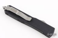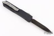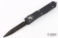 This Ultratech OTF automatic by Microtech knives features a D/E DLC black double edged blade blade with a standard edge, and a black aluminum handle with blasted hardware, tip down carry. Glass breaker. S/N 48404. Dated 11/2014. Excellent Condition.