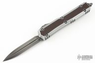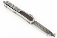 This Makora OTF automatic by Microtech features a distressed double edge blade. The handle has a satin silver/black aluminum frame with leather inlays, stainless steel clip, tip down carry. Dated 07/2024 on clip. Comes with the original box and papers. Excellent Condition.