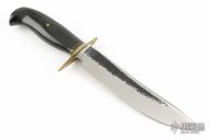 This Fighter by James Behring features a satin finished and hammer marked blade with false top edge, .253" blade stock and 1.589" blade depth, hidden tang construction. The handle has a brass guard, black linen micarta grip with a brass pin, black/brass spacers. Comes with a zippered case. Excellent condition.
