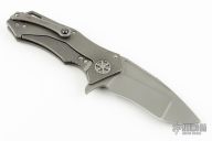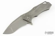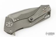 This Marfione Custom knife features an Apocalyptic finished blade with notched thumbrest and flipper. The handle has a milled titanium frame with titanium lockbar, tip up clip and backspacer and hardware, lanyard hole at the butt. Comes with original box, metal COA, and zipper case. Dated 05/2015. Excellent condition.