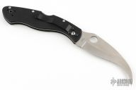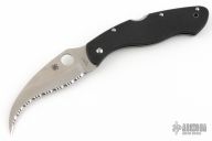 This Civilian Lockback Folder by Spyderco has a satin finished, fully serrated hawkbill blade with thumb hole. Handle is black G-10 with stainless steel (single) liner, stainless steel backspacer/ lock, and tip up/ down 2-way reversible RH black stainless steel clip. Excellent Condition.