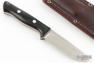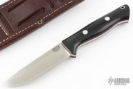This Bravo-1 LT by Bark River Knives features a satin finished blade with .159" blade and 1.132" blade depth, full tang construction. The handle has black canvas micarta scales with red liners and aluminum pins. Comes with a brown leather sheath and original box. Excellent condition.