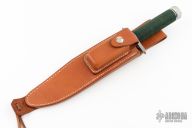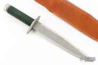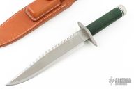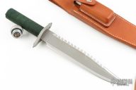 This survival knife by Andy Wood is #17 of about 36 made under license from the Lile Shop. It features a two tone blade with bead blasted center and satin finished grinds, serrated top edge and 14 saw-teeth on blade spine, .244" blade stock and 1.455" blade depth, hidden tang construction. The handle has a bead blasted stainless steel double guard with flat and Phillips head screw drivers, hollow cord wrapped handle, and aluminum removable butt cap with an O-ring to make it water-proof. Comes with brown leather sheath that has a honing stone in the front pocket. Has compass in butt cap. Excellent condition. Inside the handle is marked "A Wood Knives Movie Finish"