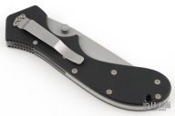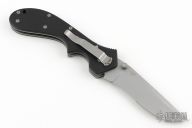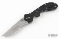 This knife by Timberline Knives has a bead blasted partially serrated blade with dual thumb studs and notched thumbrest. Handle is black FRN composite scales, stainless steel liners and tip up clip. Excellent Condition.