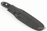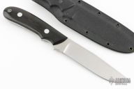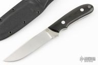 This KS-3 Pro Guides Knife  by Dozier Knives features a satin finished blade with .182" blade stock and 1.046" blade depth, full tang construction. The handle has black linen micarta scales with aluminum pins and lanyard hole. Comes with kydex sheath with belt loop. Excellent condition.
