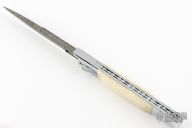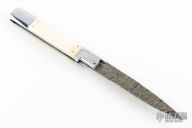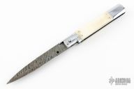 This Picklock Auto by Agasi Hambartsumian of Armenian Doctor Knives features a Damascus bayonet ground blade with a false top edge. The handle has a polished stainless steel frame with fileworked stainless steel backspacer, white bone scales with brass pins. New from maker.