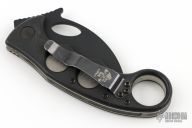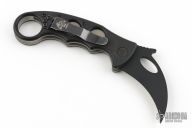 This Emerson Combat Karambit has a black chisel ground hawk bill blade with notched thumb rest and wave feature. Handle is comprised of black G10 scales, titanium liners with and has a lanyard hole at the butt. Also has a black anodized stainless steel clip.  Dated 2006 with serial number 4010. The blade has been reground. Has a few light scuffs/scrtatches otherwise good condition.