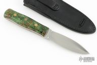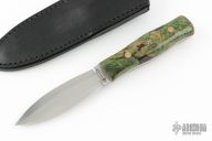 This Dagger by Robb Gray features a hand rub satin finished double edged blade with .081" blade stock and .991" blade depth, full tang construction. The handle has dyed maple burl scales with red liners, mosaic and engraved brass pins. Comes with a black leather sheath. Excellent condition.