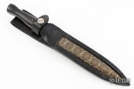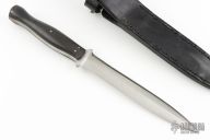 This dagger by Robert Rhodes of Little Bear Forge features a satin finished double edged blade with .232" blade stock and 1.125" blade depth, full tang construction. The handle has dark wood scales with nickel silver pins. Comes with a black leather sheath with snake skin inlay. Has some scratches and light oxidation, otherwise good condition.