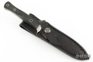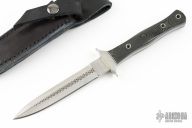This Dagger by Tim Steingass features a satin finished chisel ground double edged blade with .119" blade stock and .800" blade depth, full tapered tang construction. The handle has a stainless steel guard, black linen micarta scales with black/white liners. Comes with a black leather sheath. Excellent condition.