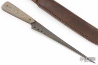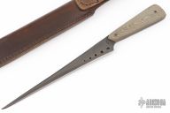 This Stiletto by Ricky Fowler features a black blade with false top edge, .189" blade stock and 1.013" blade depth, full tang construction. The handle has green/tan linen micarta scales. Comes with a brown leather sheath. Has some scuffs, otherwise excellent condition.