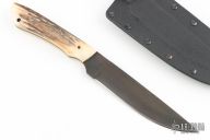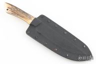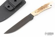 This knife by "Fowler" (please let us know which Fowler this is) features a black blade with notched thumbrest, .128" blade stock and 1.151" blade depth, full tang construction. The handle has stag scales with black linen micarta pins and a lanyard hole. Comes with a kydex sheath. Has a few light scratches, otherwise excellent condition.