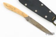 This neck knife by Master Smith Murray Carter features a San Mai Damascus drop point blade with .087" blade stock, .670" blade depth, full tapered tang construction. The handle has mammoth ivory scales with mosaic and nickel silver pins. This knife includes a kydex neck sheath. Has some scrathces and oxidation, has been used, otherwise good condition.