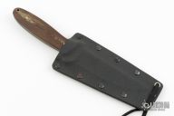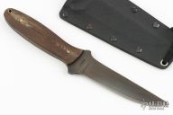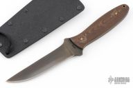 This knife by Ricky Rowler features a black blade with .127" blade stock and 949" blade depth, full tang construction. The handle has brown linen micarta scales with brass pins. Comes with a kydex neck sheath. #1800 on ricasso. Has some light scuffs/scratches from the sheath, otherwise good condition.