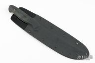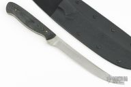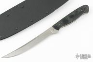 This Fillet Knife from Ricky Fowler has a satin finished with .095" blade stock and .845" blade depth, full tang construction. The handle has black canvas micarta scales. Comes with a kydex sheath. Has some scratches, otherwise good condition.
