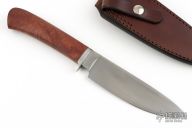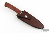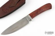 This hunter by Brett Gatlin features a hand rub satin finished blade with .205" blade stock and 1.424" blade depth, hidden tang construction. The handle has a satin stainless steel guard, burl wood grip. Comes with a brown leather sheath by Rowe's Leather. Excellent condition.