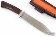 This Bowie by Master Smith John Fitch features a flat ground blade with a hand rubbed satin finish and a nearly sharpened clip, .188" blade stock and 1.494" blade depth, hidden tang construction. The handle has a stainless steel guard, desert ironwood burl grip with black/yellow spacers. Comes with a beautiful hand tooled brown leather sheath by Rowe's Leather. Has some some scratches and oxidation on the blade, otherwise good user condition.