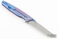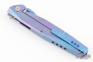 This 1507S flipper by Rike Knife features a bead blasted tanto S35VN blade with dual anodized titanium thumbstuds and a notched flipper, has a dimpled thumbrest. The handle has a milled and anodized titanium frame with matching backspacer and tip up clip, stainless lockface insert. Rides on bearings, nice detent, lockup and blade seating. Has a couple light scuffs and scratches, excellent condition otherwise.