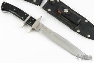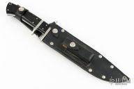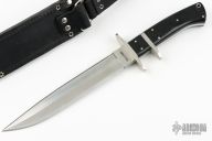 This Black Bear Classic by Cold Steel features a satin finished clip point blade with sharpened top edge, .221" blade stock and 1.181" blade depth, full tang construction. The handle is comprised of a stainless steel guard and sub hilt with black linen micarta scales and nickel silver pins. Lanyard tube in pommel. Includes leather sheath with stone and belt loop. Has some scratches, otherwise good condition.