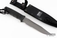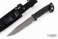This Seal 2000 Fighter by SOG Knives has a grey coated partially serrated clip point blade with hidden tang, .236" blade stock and 1.378" blade depth. Handle is contoured glass reinforced nylon with lanyard hole. Comes with nylon sheath. Excellent condition.
