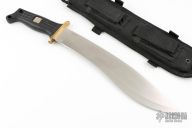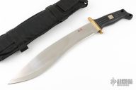 This Pathfinder Kukri from Al Mar Knives features a kukri style satin finished blade with .176" blade stock and 2.390" blade depth, hidden tang construction. The handle is comprised of a brass guard and grooved polymer handle over hidden tang construction. Gold Al Mar "chop" in handle. Includes tactical cordura sheath with auxiliary pockets. Has a few light scratches, otherwise excellent condition. 196/200
