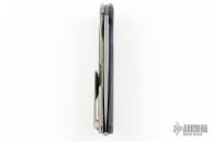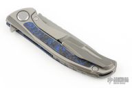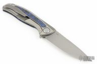 This Hati Gen3 by Shirogorov Knives features a drop point blade with notched thumbrest and flipper. The handle has Blue Techno Carbo and titanium frame with Blue Techno Carbo inlay, titanium tip up clip with hidden screws, titanium backspacer with lanyard hole. Rides on bearings, nice detent, lockup and blade seating. Comes with COA and original box. Excellent condition.