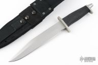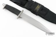 Hard to find BMF by Gerber has been out of production for a number of years. The blade is matte finished as are the guard and butt cap. .247" thick and 1.495" deep. Non-skid handle. Comes with a black nylon sheath with front pocket. Has some light oxidation/patina spots, otherwise excellent condition for its age. Highly desirable tactical knife. #053723. Comes with original box.