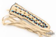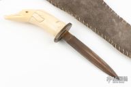 This dagger features a blued double edged blade with .183" blade stock and .753" blade depth, hidden tang construction. The handle has an oval guard with a carved bone grip in the shape of a dolphin. Comes with a beaded leather sheath. Has some oxidation/patina, otherwise good condition.