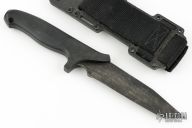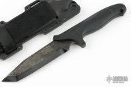 This Specwar Fixed Blade by Timberline Knives features a black tanto chisel ground blade, @ 60 RC, 0.200" blade thickness and 1.393" blade depth. The handle is fiberglass reinforced nylon with a stainless steel butt plate for striking. Comes with original sheath. This collaboration between Ernie Emerson and Vaughn Neeley won "American Made Knife of the Year" at the 1995 Blade Show. Excellent condition. Hard to find. Has some scratches, the blade finish has been altered (refer to the pictures), otherwise good condition.
