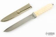This San Francisco Dirk by Richard Worthen features a hand rub satin finished blade with false top edge, .179" blade stock, .975" blade depth, hidden tang construction. The handle has a stainless steel guard and a spriral fluted walrus ivory grip with stainless steel finial. Comes with a nickel silver sheath with clip. Has scratches on the sheath, otherwise excellent condition. #351