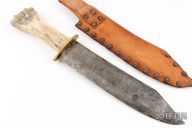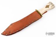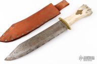 This large bowie features a clip point blade with .237" blade stock and 2.448" blade depth, hidden tang construction. The handle has a brass guard and a bone grip. Comes with a brown leather sheath. Has a crack in the handle, has oxidation and patina, has scratches, fair condition.