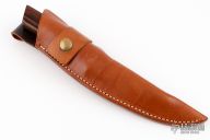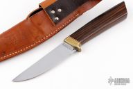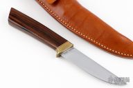 This Model C425 by Gerber Legendary Blades features a satin finished blade with .107" blade stock and .943" blade depth, hidden tang construction. The handle has a brass guard and a rosewood grip, red/white spacers. Comes with a brown leather sheath. Has some light scratches, otherwise good condition.