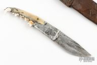 This knife features a rustic looking blade, .066" blade stock and 1.246" blade depth, hidden tang construction. The handle has a cast pewter guard with skull and cross bones stamped into it, and a coyote jaw bone grip with a copper pin. Comes with a brown leather sheath. Good condition.