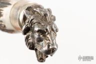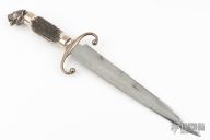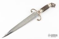 This dagger has a double edged blade with unsharpened edges, .224" blade stock and 1.733" blade depth, hidden tang construction. The handle has a silver guard, collar and lions head at the butt. Has scratches, oxidation and patina, fair condition.