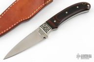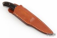 This hunter by Parker Cutlery Company features a mirror polished blade with notched thumbrest, .173" blade stock and 1" blade depth, full tang construction. The handle has engraved nickel silver bolsters, red/black paper micarta scales with nickel silver pins and lanyard hole. Comes with a brown leather sheath. Has a few light scratches, otherwise excellent condition.