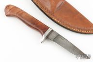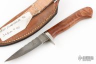 This knife by Godfrey features a Damascus blade with fileworked spine, .112" blade stock and .777" blade depth, hidden tang construction. The handle has a stainless steel guard with a wood grip. Comes with a hand tooled brown leather sheath. Blade reads "AKCA 1992" and "40 of 60". Has some light scratches and patina, otherwise excellent condition.
