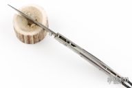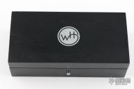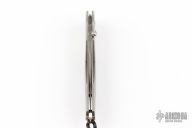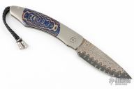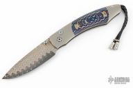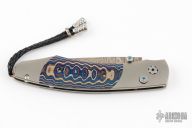 This B12 Blue Heat by William Henry Fine Knives features a "Copper Wave" San Mai Damascus blade with VG-5 core, single thumbstud with sapphire inset in a gold bezel. The handle has a blasted titanium frame with heat-blued 'Wave' mokume scales, sterling silver lanyard bail with black leather lanyard and sterling silver beads. Nice lockup and blade seating. Comes with original box, sheath and COA dated June 18, 2021. Excellent condition.