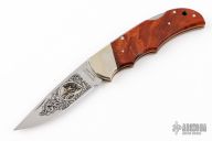 This Model 23 Limited Edition knife by Browning features a mirror polished blade with nail nick. The handle has nickel silver bolsters, exotic quince wood scales, brass liners and stainless backspacer. Comes with original box and papers. 1 of 3000. Has some light patina, otherwise excellent condition.
