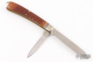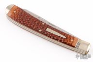 This Bullet Knife by Remington has two satin finished blades with nail nicks. The handle has fluted nickel silver bolsters, faux jigged bone covers, brass liners and steel springs. The knife has scuffs, scratches, and patina. Great condition for its age.
