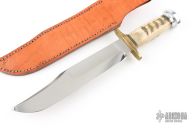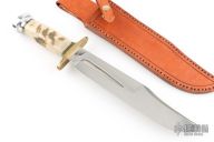 This Bowie by Steve Voorhis features a mirror polished clip point blade with false top edge and fullers, .227" blade stock, 1.830" blade depth, hidden tang construction. The handle has a brass guard, sheeps horn grip, aluminum butt, black/brass spacers. Comes with a brown leather sheath and a zippered case. Excellent condition. Has a few very fine scratches.