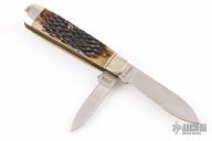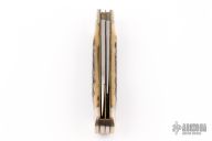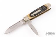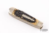 This slipjoint by Remington Knives features a satin finished blades with nail nicks. The handle has nickel silver bolsters, jigged bone covers with a nickel silver bullet escutcheon, brass liners and stainless steel spring. Has half-stop, flush in all positions. Has some scratches, and patina. Great condition otherwise.