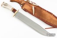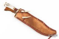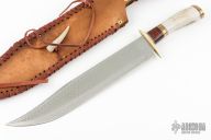This Stag Bowie has a satin finished and jeweled clip point blade with sharpened top edge, .094" blade stock and 1.991" blade depth, hidden tang construction. The handle has a brass guard and butt, stag and cocobolo grip with red/white/black/brass spacers. Comes with a hand tooled brown leather sheath. Excellent condition.