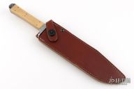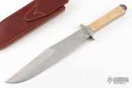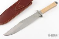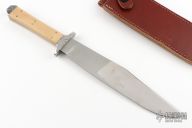 This Bowie by Arvin (please let us know if you know who this maker is) features a mirror polished blade with false top edge, .166" blade stock and 1.671" blade depth, full tang construction. The handle has a fileworked stainless steel guard and rear bolsters, paper micarta scales with black liners. Comes with a brown leather sheath. Has some scratches, otherwise good condition. Comes with a zippered case.
