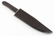 This Bowie by Ben Voss has a hand rub satin finished blade and sharpened top edge, .180" blade stock and 1.262" blade depth, full tapered construction. The handle has a nickel silver guard, hand checkered desert ironwood scales with coin edged brass liners. #2 on ricasso. Comes with a black leather sheath dated 1992 and #2 on the back. Excellent condition. Comes with a zippered case.