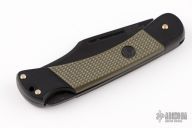 This Commando by Puma Knives features a black finished clip point blade with nail nick. It has a black aluminum frame with green insets. #28491. Has some light scratches, otherwise excellent condition.