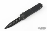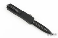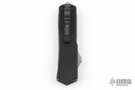 This Executive Scarab OTF auto by Microtech has a black D/E blade with fullers. The handle is black aluminum with a single glass breaker, tip down black stainless steel clip. Blasted hardware. Dated 08/06 and S/N 00901. Comes with original sheath. Excellent condition.