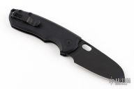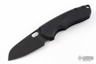 This F5.5 by Urban EDC Supply is a Vox Design. It features a dark tumble finished blade with thumbhole and notched thumbrest. The handle has black g10 scales, blasted titanium liner, backspacer and tip up clip. Rides on bearings, nice detent, lockup and blade seating. Has a couple light scuffs, excellent condition otherwise.