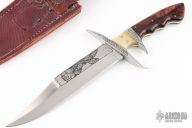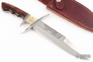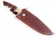 This knife by Don Pauack (i think my spelling of his name may be wrong, please let me know if you know who this maker is) features a hand rub satin finished blade with a false top edge and engraved flats, .260" blade stock and 1.515" blade depth, full tang construction. The handle has an engraved stainless steel guard and sub-hilt, sheeps horn and cocobolo scales with stainless and mosaic pins. Comes with a brown leather sheath. Has a couple light scratches, otherwise excellent condition.